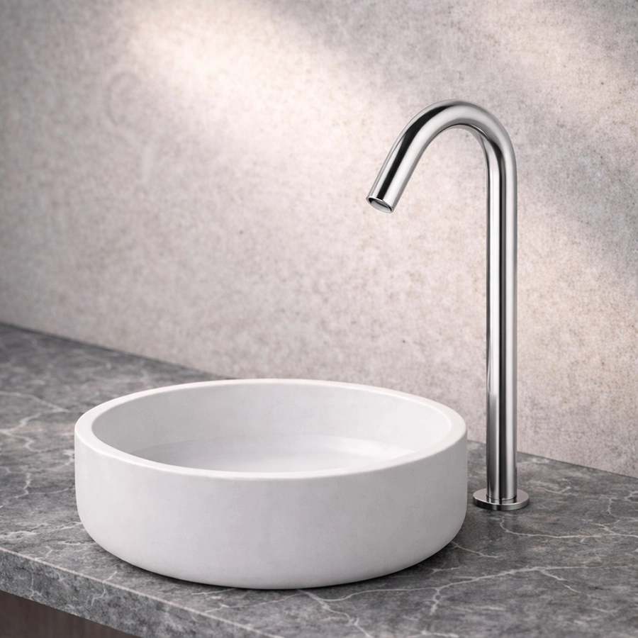 Stylish curve-neck design sensor tap. Solid brass construction. Finish: Chrome-plated. Hands free infrared activation.